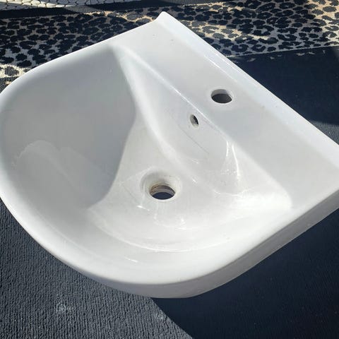 Runt handfat i porslin. Använt men i fint skick. Inkluderar bottenventil, vattenlås, monteringsskruvar, etc. För mått, se bild.
