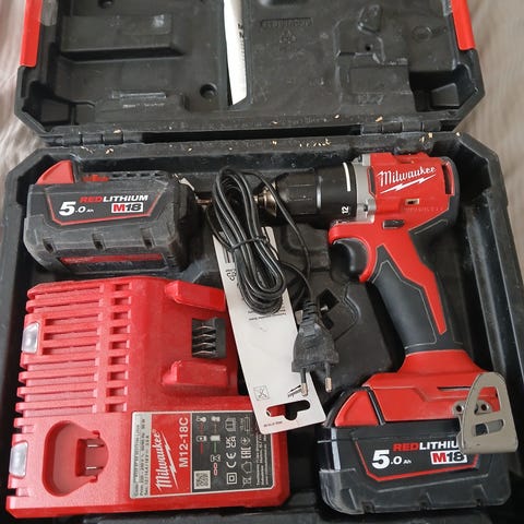 Milwaukee borrskruvdragare 18V i röd/svart färg. Maskinen är batteridriven och har inställningar för moment och växlar för olika borr- och skruvuppgifter. Passar för användning med kompatibla Milwaukee 18V-batterier och laddare. Utrustad med chuck för snabbfäste av borr och bits samt ergonomiskt handtag med gummigrepp för bättre kontroll vid arbete i trä, metall och andra material.