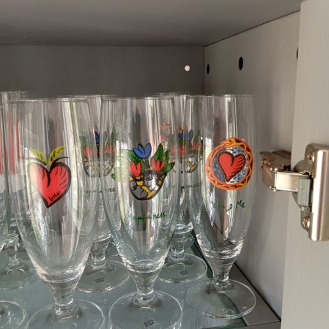 Kosta Boda glas och skålar i färgat glas. Blandade delar i olika modeller och storlekar, bland annat dricksglas, skålar och assietter. Färgerna inkluderar grönt, lila, blått och mörkare tonat glas. Passar som vardagsservis eller till servering av dryck, dessert och snacks. Alla delar är i glas och har typisk Kosta Boda-design med strukturerad yta och varierande former.