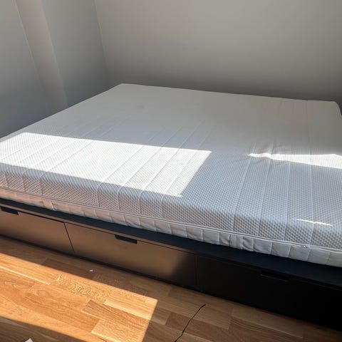 Madrassen är ca 20 cm tjock och välanvänd. Föjler med ny bäddmadrass ovanpå i mycket gott skick.