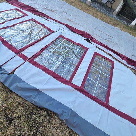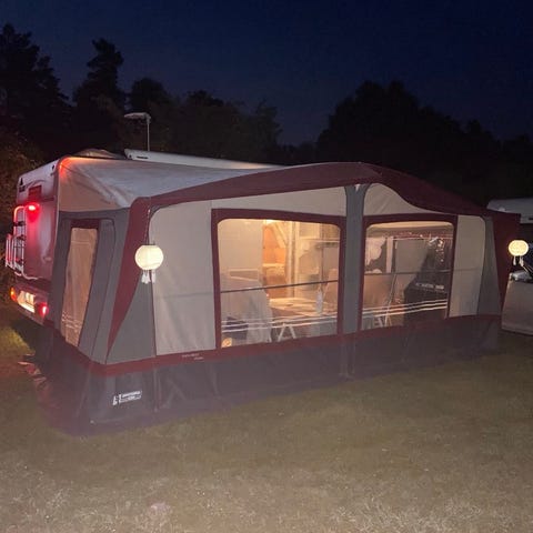 Ventura Atlantic Marine förtält i modell A1050/G20. Förtältet är avsett för husvagn och består av duk i blå och grå färg med integrerade fönsterpartier. Kraftiga öljetter och förstärkningar för uppsättning. Passar som säsongs- eller reseförtält beroende på vagnens mått och båglängd enligt A1050/G20-specifikationen. Märkning på insidan: Ventura Atlantic Marine A1050/G20 179010500