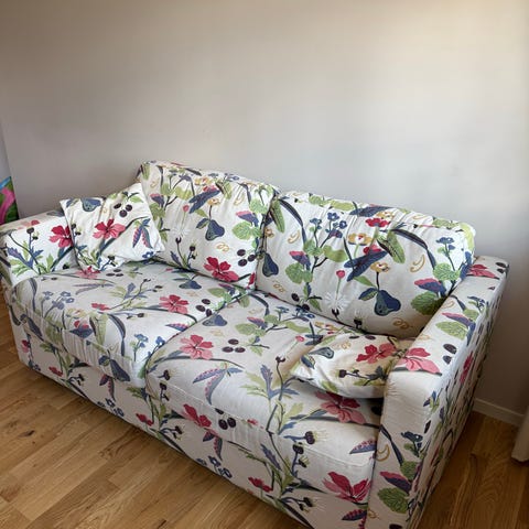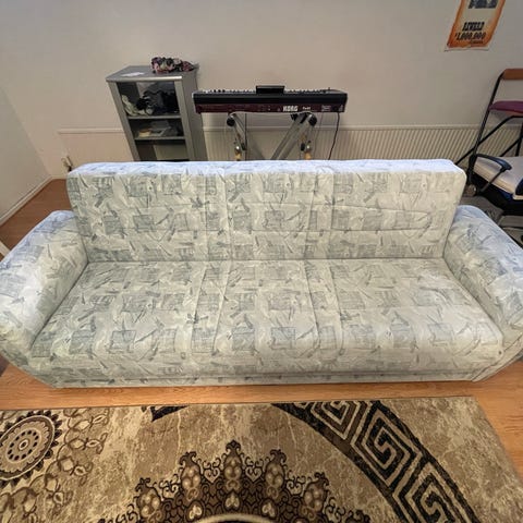 Enkel bäddsoffa, lätt att fälla ut, bra förvaring i. Grå melerad i fint skick.