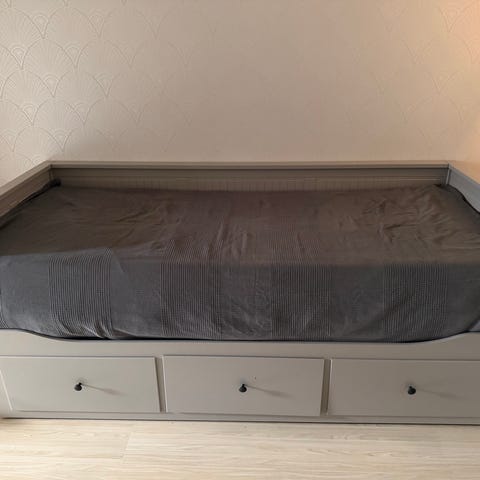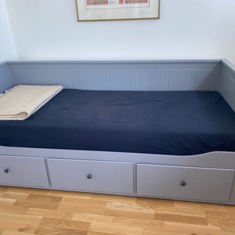 Klassisk dagbädd från IKEA. Fungerar som soffa, och går att dra ut till dubbelsäng. Två stora lådor undertill ger bra förvaring.