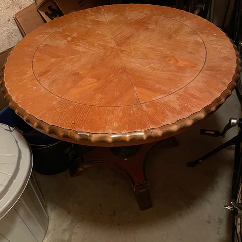 Säljer mitt bruna bord med fyra stolar till. Kostar 600kr för allt.