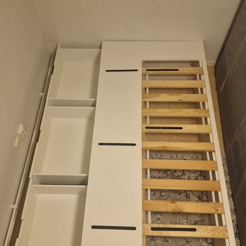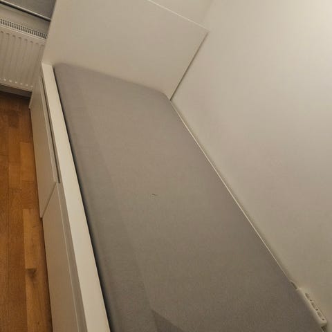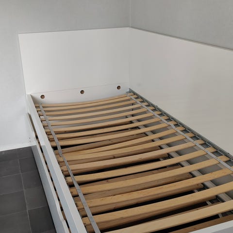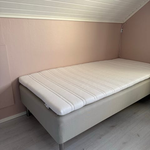 Säljer en sängram från ikea för 90 madrass. Madrass medföljer om man vill i befintligt skick.
