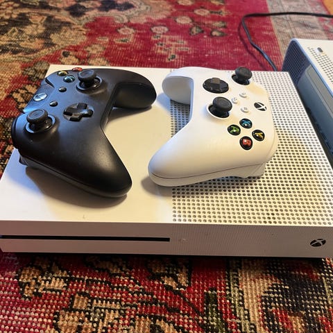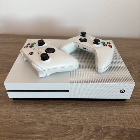 Microsoft Xbox One S spelkonsol vit med två handkontroller
