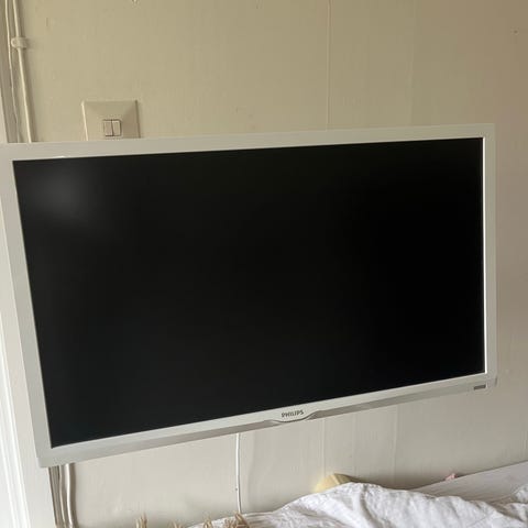 Sony tv med vit ram. Väggmonterad modell enligt bilderna, lämplig för användning i vardagsrum, kök eller sovrum.
