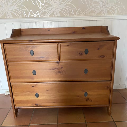 Byrå med tre låder. Vit målad med svarta knoppar.