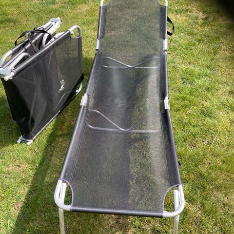 FIAM hopfällbar solsäng. Sängen har svart liggyta i vävd syntetväv och ställbar ryggdel. Ram i metall med elastiska snoddar som fäster tyget mot stommen. Solsängen är avsedd för utomhusbruk på exempelvis altan, balkong eller trädgård och kan enkelt fällas ihop för förvaring eller transport.