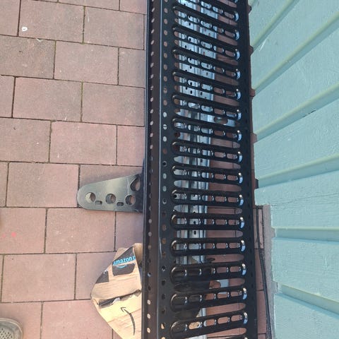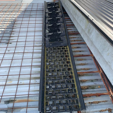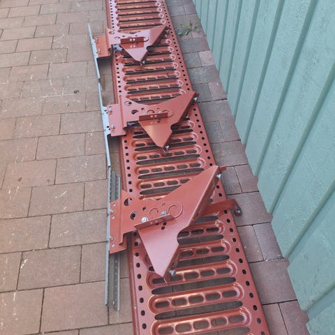 Takstege och takbrygga i metall. Paketet innehåller flera sektioner av takstege samt en perforerad takbrygga, samtliga i metall med galvaniserad yta. Delarna är avsedda för montering på tak för att underlätta säker förflyttning och arbete på takytor. Fästen för montering ingår enligt bild.