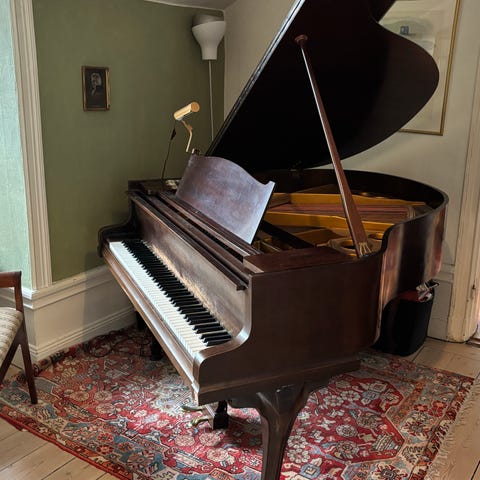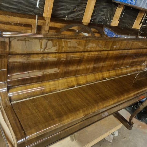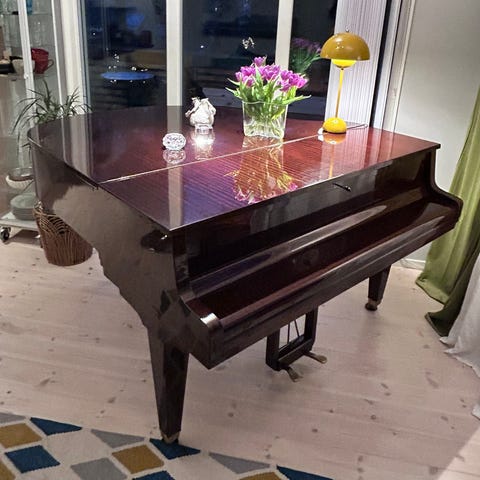Rosenwall flygel stomme i trä med brun finish. Objektet består av flygelns ram, resonansbotten, strängar och delar av mekaniken. Passar för den som vill renovera en äldre flygel, använda delar som reservdelar eller bygga om stomme och trädetaljer för andra projekt. Mått och exakt modell är inte angivna utan får uppskattas på plats.