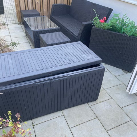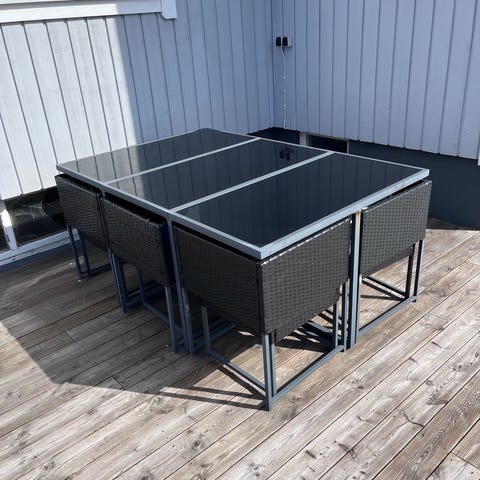 Planteringslåda och fristående blomkrukor i svart konstrotting för utomhusbruk. Setet består av rektangulär planteringslåda samt högre och lägre krukor på ställning. Lämpliga för plantering av blommor, örter eller mindre växter på altan, balkong eller uteplats. Konstrotting är ett vädertåligt material som är anpassat för användning utomhus.