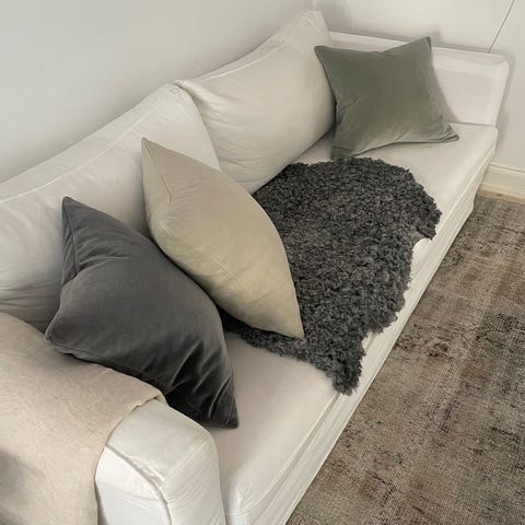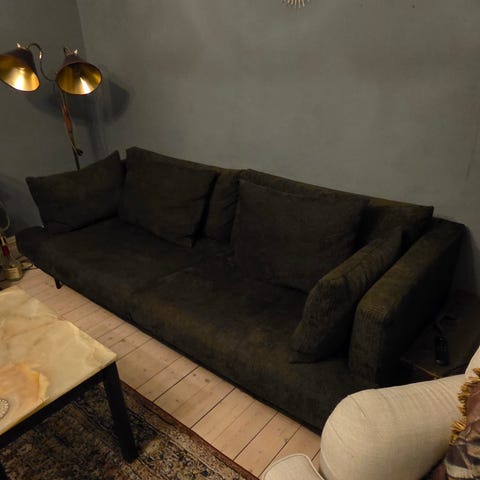 I gott skick! Ett hål i en prynadskudde samt nedtill på soffan (syns inte om man inte tittar på nära håll)