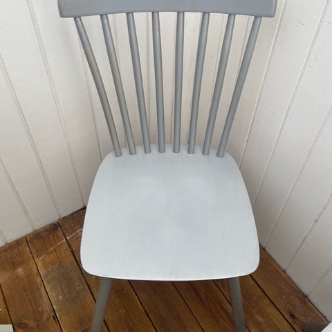 Två pinnstolar. Lite olika form men målade i samma gröna nyans. Lite avskavd färg. 200 kr för båda.