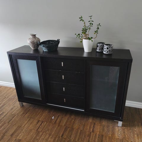Mörkbrunt. Längd 180 cm. Kan delas till 120 + 60cm . Djup 42 cm. Höjd 75 cm.