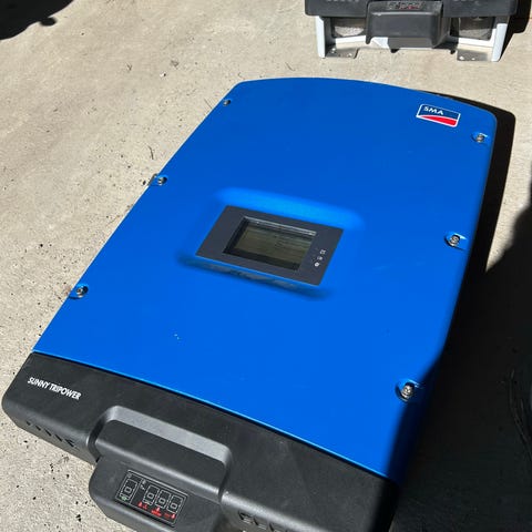 SMA växelriktare för solcellsanläggning. Enheten är väggmonterad och har blå kapsling med inbyggd display och statuslampor på fronten. Passar för användning i solcellssystem för omvandling av likström från solpaneler till växelström för hushållsbruk eller annan ansluten utrustning. Manual medföljer enligt bild.
