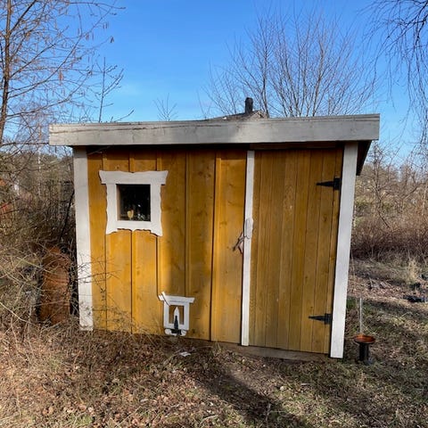 Hönshus i trä med svart utsida. Huset har fönster som släpper in ljus, en mindre ingång med ramp för hönsen samt ventilationsgaller. Insidan är enkel med sittpinne och yta för höns att röra sig eller vila. Passar för mindre besättning och kan placeras i trädgård eller hage. Byggnaden står upphöjd från marken, botten är lite drygt 1 x1 m. Är isolerat och tätt mot både väder, vind och möss. Behöver lite färg och tvätt annars fullt fungerande. Pris kan diskuteras vid snabb affär.