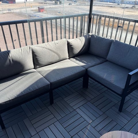 Brafab Soffa Belfort, med vit stomme i aluminium. Tre lösa grå sitt- och ryggdynor. Passar som inomhus- eller uterumsmöbel. En ljusgrå klädsel följer med som är helt ny. Finns två små runda bord i vitt och grått som hör ihop med soffan. Även ett väderskydd ingår men det är en reva, går att laga.