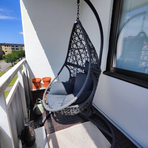 String/balkongstol i beige färg med sits av spända snören och ben i metall. Passar för användning på balkong eller uteplats. Stolen har rundad, skålformad sits och smala ben som ger ett lätt uttryck och gör den enkel att placera i mindre utrymmen.