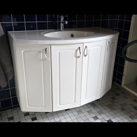 Badrumskommod med integrerat tvättställ i vitt porslin. Kommoden har två lådor med handtag på fronten för förvaring av badrumsartiklar. Tvättstället är rektangulärt med en centrerad ho och blandare monterad på bakkanten. Passar för installation i badrum där det finns behov av kombinerad förvaring och handfat. På ytan av tvättstället finns en mindre skada som syns på bilden, ca 2 mm stor.
