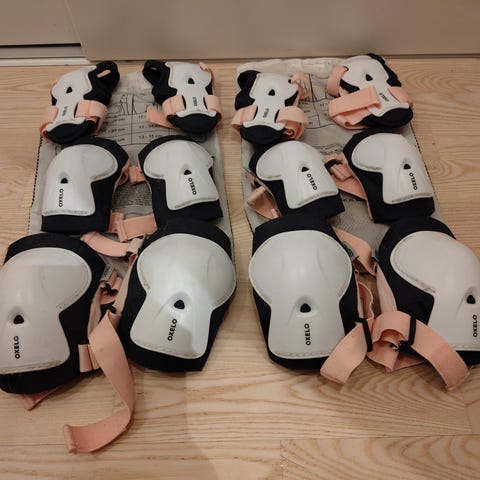 Skate Gear Jr skyddsutrustning för barn, anpassad för rullskridskor och inlines. Setet består av tre delar med skydd för handleder, knän och armbågar. Utsidan har hårda svarta skal med rosa detaljer och insidan är vadderad för ökad komfort. Fästs med justerbara remmar med kardborre för att kunna anpassas efter barnets storlek. Passar som grundläggande skydd vid åkning med rullskridskor och inlines.