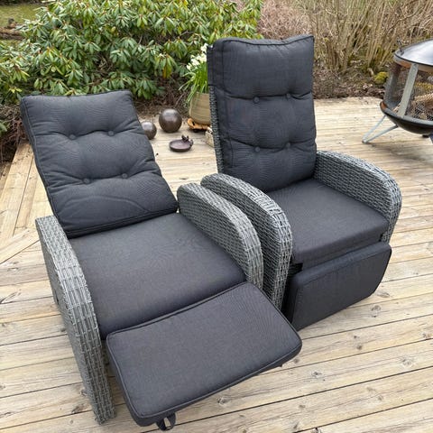 Säljer 4 st trädgårds fåtöljer i grå konstrotting med gråa dynor.
