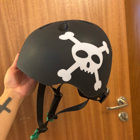 Jag säljer en hjälm för barn i svart färg med vitt döskallemotiv på sidorna. Hjälmen har flera ventilationshål upptill samt justerbart hakband med plastspänne. Passar exempelvis för cykel, sparkcykel eller liknande aktiviteter där huvudskydd behövs. Ytan har tydliga repor och märken efter användning. Strl xs 48-53cm