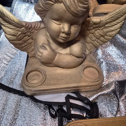 Charmig handgjuten betongfigur föreställande ett damsällskap sittande tillsammans.