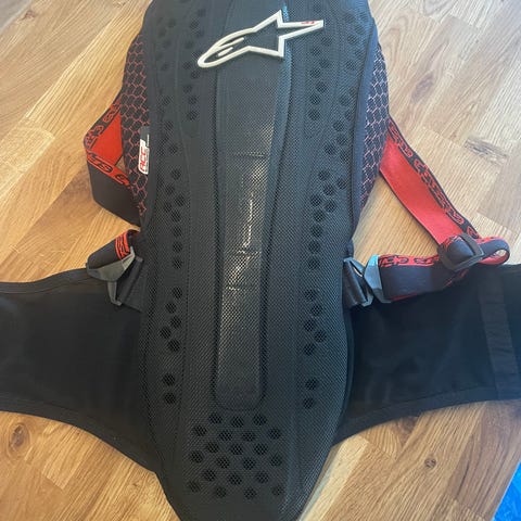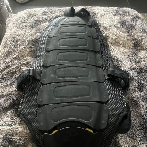 Scott ryggskydd i storlek S/M, avsett för kroppslängd runt 170-180cm.. Ryggskyddet har justerbara axelremmar och brett midjebälte med kardborre för stabil passform. Konstruktionen består av ett hårdare ytterlager och ett perforerat, dämpande inre lager för stötdämpning och ventilation. Färg huvudsakligen svart med orange detaljer. Lämpligt som skydd vid exempelvis cykling, utförsåkning eller annan aktivitet där extra ryggskydd önskas.