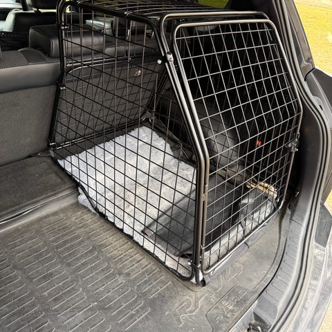 Hundbur för bil i aluminium, färg svart. Buren har galler på sidor och fram samt en dörr med lås. Mått: bredd 65 cm, djup 85 cm, höjd 65 cm, ovansida 54 cm. Anpassad för transport av hund i bil och ger en avskild och ventilerad plats under resor. Vi har endast använt den ett par gånger.