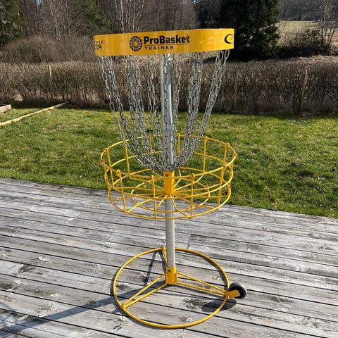 Royal Basket discgolfkorg i metall. Korgen är fristående med kedjor för att fånga discar och rund fot för placering på mark. Lämplig för träning och spel av discgolf i trädgård eller på enklare bana.