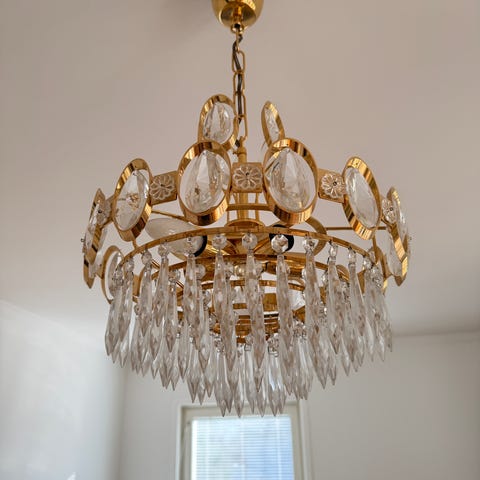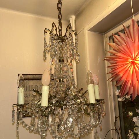 Säljer en vacker liten kristallkrona i guldfärgad metall som ger ett elegant och klassiskt intryck. Perfekt som stämmningsbelysning i ett mindre rum, hall eller sovrum.