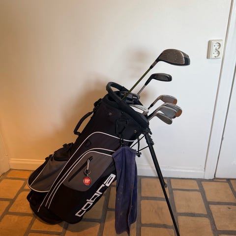 Open golfset med bärbag. Setet innehåller flera järnklubbor samt en hybrid med headcover. Bagen är en lätt bärbag med benstativ och flera fickor för förvaring av bollar och tillbehör. Passar för spelare som vill ha ett komplett grundset för golfspel.