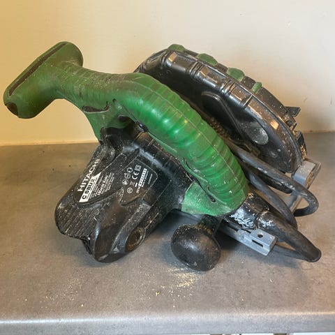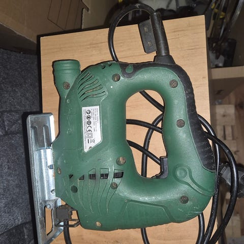 Hitachi CJ 65V2 sticksåg med elsladd. Sågen är grön och svart och levereras i original plastväska med formgjutet innerfack. Modellen är avsedd för sågning i trä och andra material enligt tillverkarens anvisningar. På sidan finns typskylt med modellbeteckning och säkerhetsmärkning. Sågen har handtag med avtryckare och anslutning för nätström via kabel. Förvaringsväskan är hård och anpassad för maskinen och tillbehör.