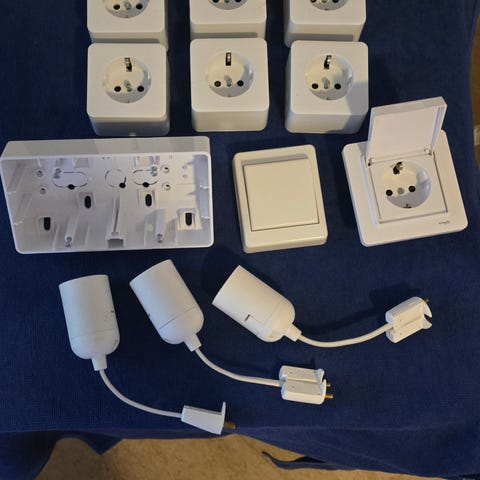 Paket med blandade hushålls- och elektronikprylar. På bilderna syns bland annat LED-lampa, LED‑ljusslinga på rulle, olika kablar, hörlurar, tändstål, två halvsulor, flera tvålar, tratt, små verktyg och diverse tillbehör. Säljs tillsammans som ett blandat paket enligt bilderna.