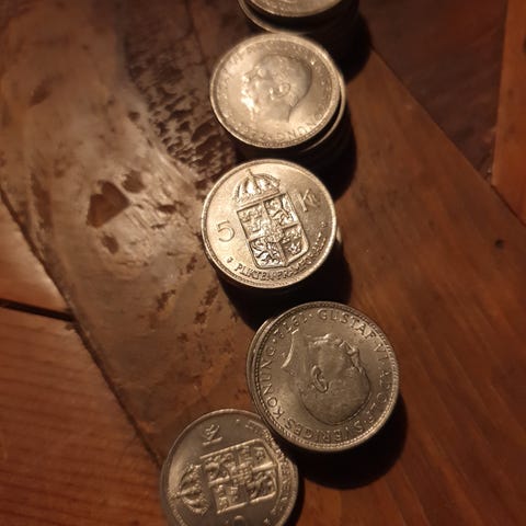 Blandade svenska och utländska mynt säljes tillsammans i en hög. Mynt från bland annat Sverige, Schweiz, Frankrike, Tyskland, Italien, Storbritannien och USA.