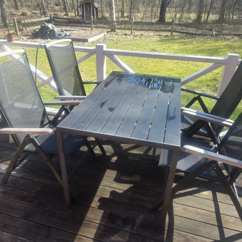 Trädgårdsbord och stolar för uteplats eller altan. Setet består av ett rektangulärt bord med skiva i ribbat material och underrede i metall, samt flera stolar med ribbad sits och ryggstöd. Möblerna är målade i svart och är avsedda för utomhusbruk, exempelvis på altan, veranda eller trädgård. Passar för sittgrupp vid måltider eller avkoppling utomhus. Behöver lite ny färg. HÄMTAS SNARAST