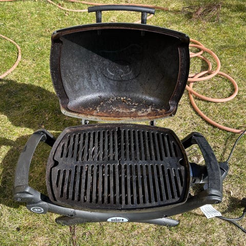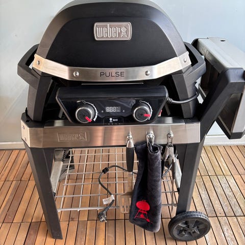 Weber Pulse 1000 elgrill med vagn. Elgrillen har digital temperaturvisning på fronten och vred för temperaturreglering. Integrerad iGrill-termometer, ansluts via iGrill-appen och hjälper användaren att se innertemperaturen på maten. Grillgallret är i gjutjärn och locket är gångjärnsfäst. Under grillen finns hylla för förvaring. På bilderna syns även en separat gjutjärnsform/platta som kan användas på grillgallret. Passar för balkong, uteplats eller trädgård där eluttag finns.