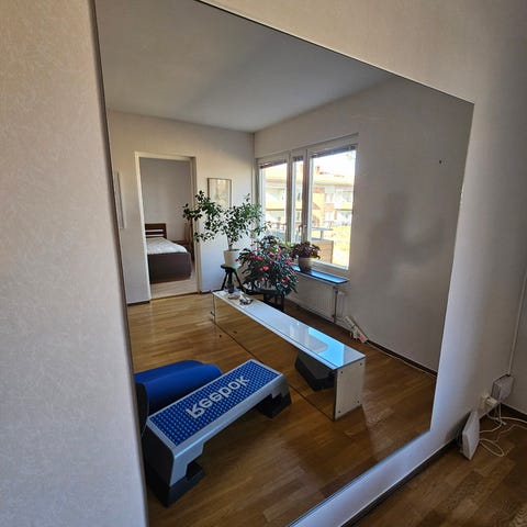 Spegeln ger rummet en exklusiv känsla och fungerar både som väggspegel och golvspegel.