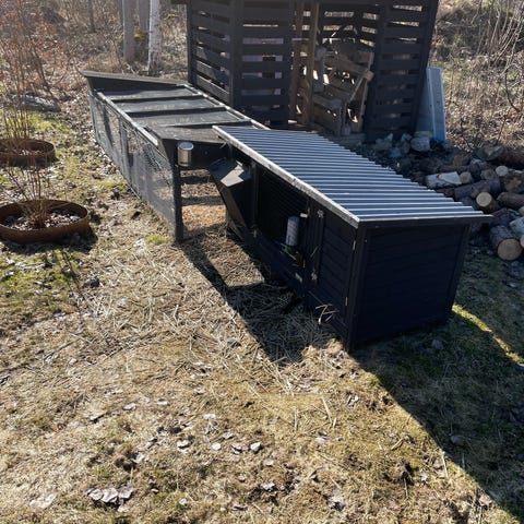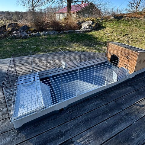 Kaninbur som kan användas som komplement till den vanliga buren för att få större utrymme. Den fungerar också bra att koppla ihop med en utomhushage. Det finns en dörr på varje långsida och en lucka på kortsidan. Lätt att montera och förankras med tillhörande markspikar. Buren fungerar också till höns (finns en sittpinne).
