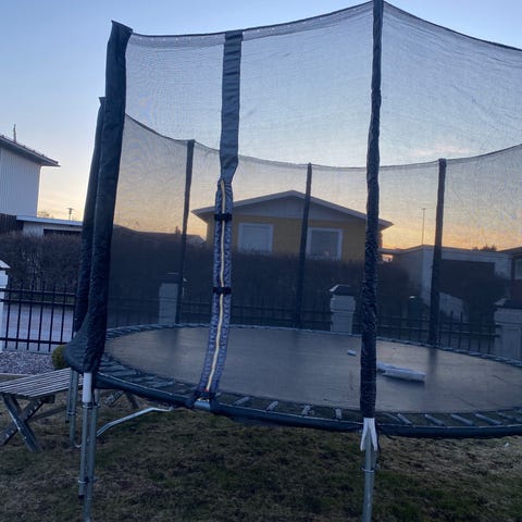 -skyddsnätet runt har slitage och en reva, se bild, den går nog att sy ihop med snöre, alternativt köpa nytt från tillverkaren. Man behöver inte använda nätet och de höga stolparna, själva mattan fungerar ändå.