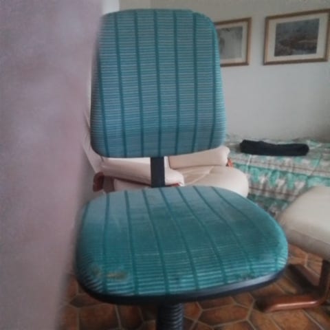 En grön kontorsstol på hjul. Både säte och ryggstöd är höj- och sänkbart. Stolen är gammal och använd men ändå i ett bra skick.