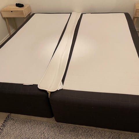 Bella Notte två resårsängar i blått tyg. Två separata sängar som kan användas var för sig eller ställas ihop till en större säng. Sängarna har textilklädd ram och ben i ljus färg. Passar som enkelsängar eller som dubbelsäng när de placeras intill varandra.