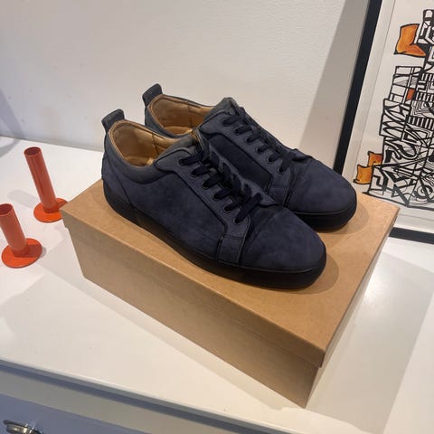 Christian Louboutin sneakers i storlek 43. Låga mörkblåa sneakers med snörning och dekorativa nitar på tån. Yttersula i gummi med karakteristisk röd undersida. Invändig sula i läder. Passar som vardagssko eller till mer uppklädda tillfällen.