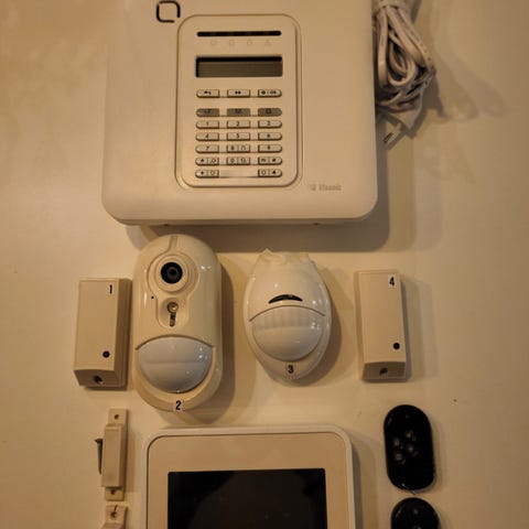 Larmcentral med tillbehör i vit färg. Paketet innehåller en centralenhet med knappsats och display och trådlösa enheter samt sensorer. Systemet kan användas för övervakning och larm i bostad eller mindre lokal. Alla delar är i matchande vit plast och är avsedda att användas tillsammans som ett komplett larmsystem,