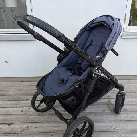 Emmaljunga sittvagn i blå med svart chassi. Vagnen har svängbara framhjul och större bakhjul. Sittdelen är utrustad med sele och bygel. Det finns varukorg under vagnen och ställbart handtag. Vagnen är liten och smidig, passar perfekt att ta med i bil, på buss, i affärer, hiss etc.