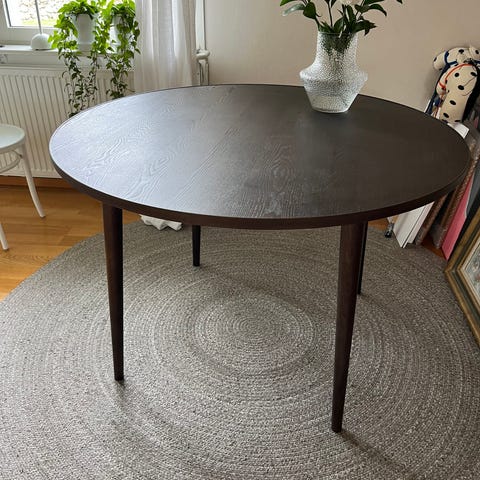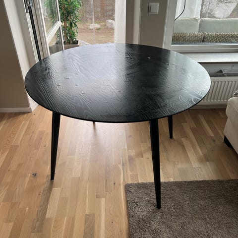 Runt matbord från ellos där bordsskivan behöver lite kärlek alternativt en snygg duk. Beige rund passande vaxduk (ny) medföljer.