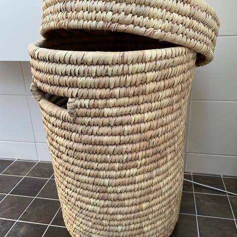Flätad korg med lock i rotting, gråaktig ton. Cylindrisk form med plan ovansida som fungerar som lock. Kan användas för förvaring i hall, vardagsrum eller sovrum, till exempel för filtar, leksaker eller annan småförvaring. Öppen insida utan fack eller extra inredning. Hej säljer en Enkelt snygg Tvättkorg Grå som är rätt stor och Rymmer mycket kläder säljs pga av inte Används är du Tjej! Kan du få den Gratis! 💯😊 men hade så klart uppskattat en slant