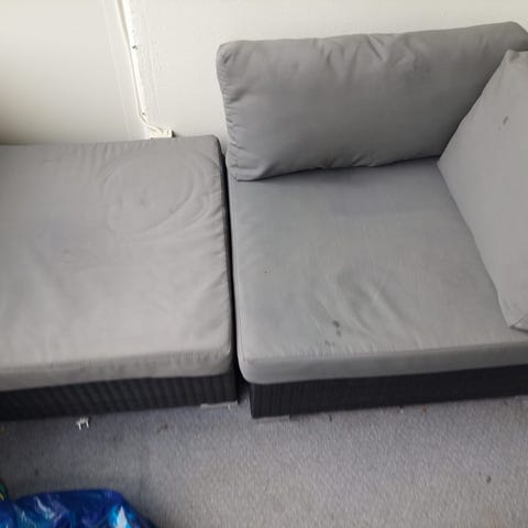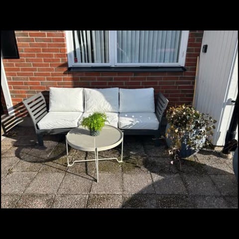 Soffan har stått på inglasad balkong och därför ej påverkats av väder och vind. Haft den i ca 5 år och inköptes från Jysk för ca 3000 kr. Ca 155 cm lång.