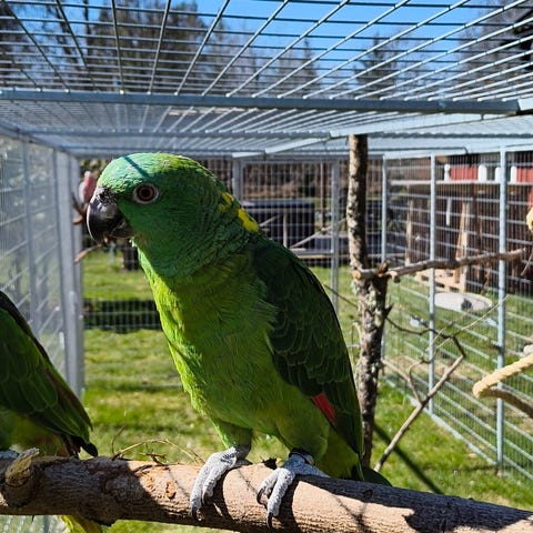 Cuba amazon hane som är född 2019 är halv tam tar godis från handen, börjar bli tamare nu när han är ensam kommer upp på armen om man lockar med når gott när jag fick hem han så kom han fram och ville bli kliad på huvudet,, han pratar, han är tystlåten man kan nog få han tam hyfsat lätt då han har varit ganska tam innan. Han har citesintyg och dna test papper.